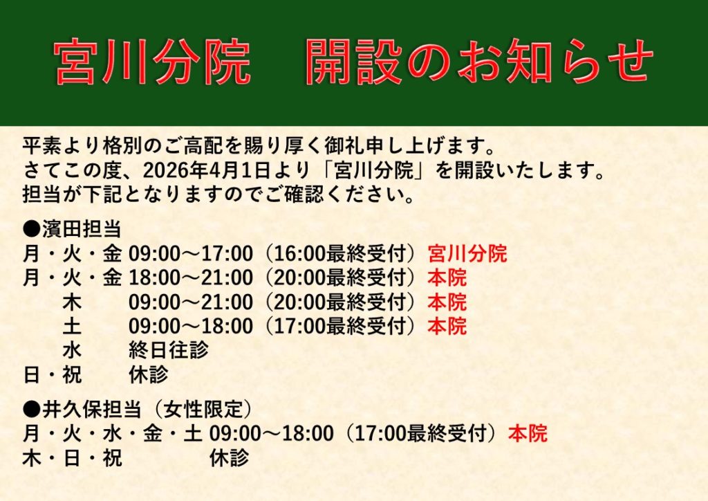 宮川分院開設のお知らせ 2026年4月2日 最終更新日時 : 2026年4月2日 はまだ三禄堂 平素より格別のご高配を賜り厚く御礼申し上げます。さてこの度、2026年4月1日より「宮川分院」を開設いたします。 詳細はこちらよりご確認ください ※宮川分院についてはご予約完了後、詳細の地図をご連絡いたします。 FacebookCopy