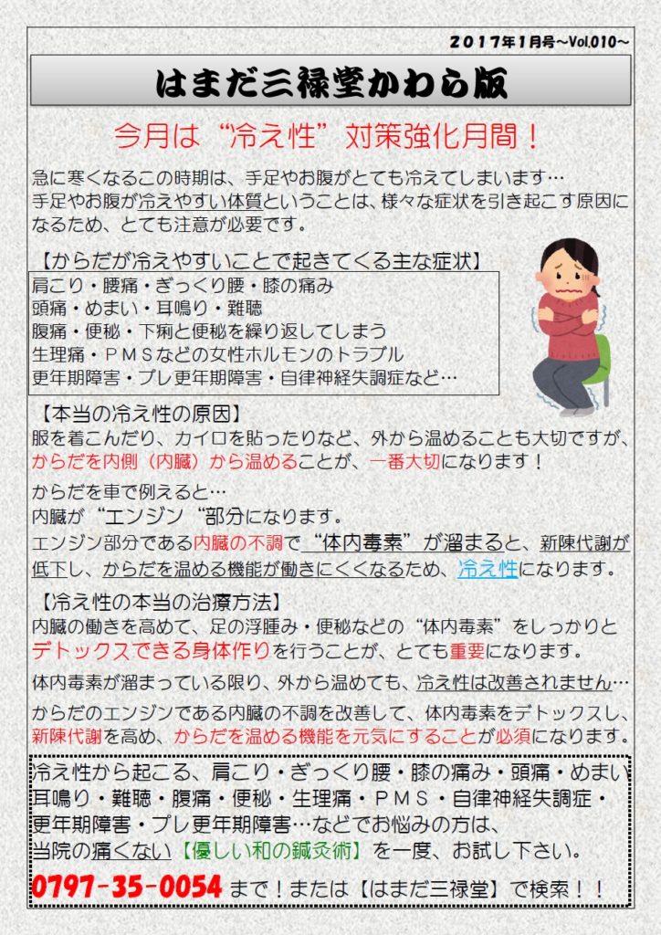 冷え性を改善するために大切なこと【2017年 はまだ三禄堂かわら版1月号】 2017年1月18日 最終更新日時 : 2026年4月2日 はまだ三禄堂 芦屋 鍼灸・はりきゅう はまだ三禄堂の濵田です。 2017年初めのはまだ三禄堂かわら版は、この寒い時期にツラくなる「冷え性」について! 冷え性を改善するためには、 ・服を着こむ ・カイロを貼る ・お風呂にゆっくり入る 以上のことも大切ですが、からだを内側から温めることが最も大切です! FacebookCopy