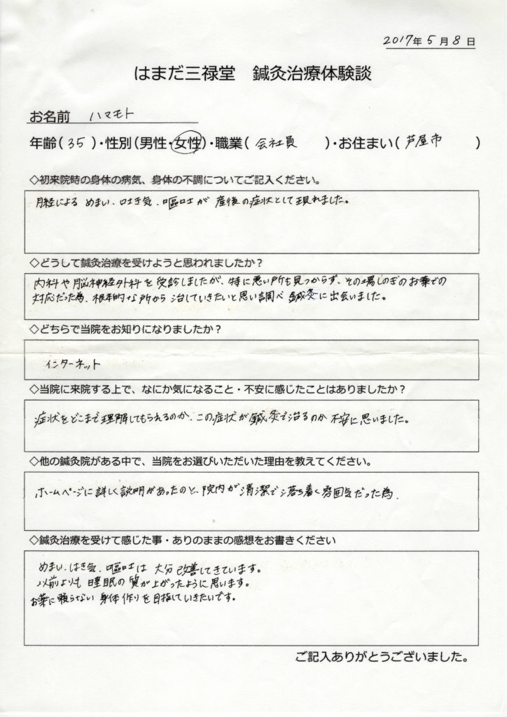 『出産後の、めまい、吐き気、嘔吐が改善してきています!』“産後、月経時に起こるめまい、吐き気、嘔吐”でお悩みのかたの治療体験談