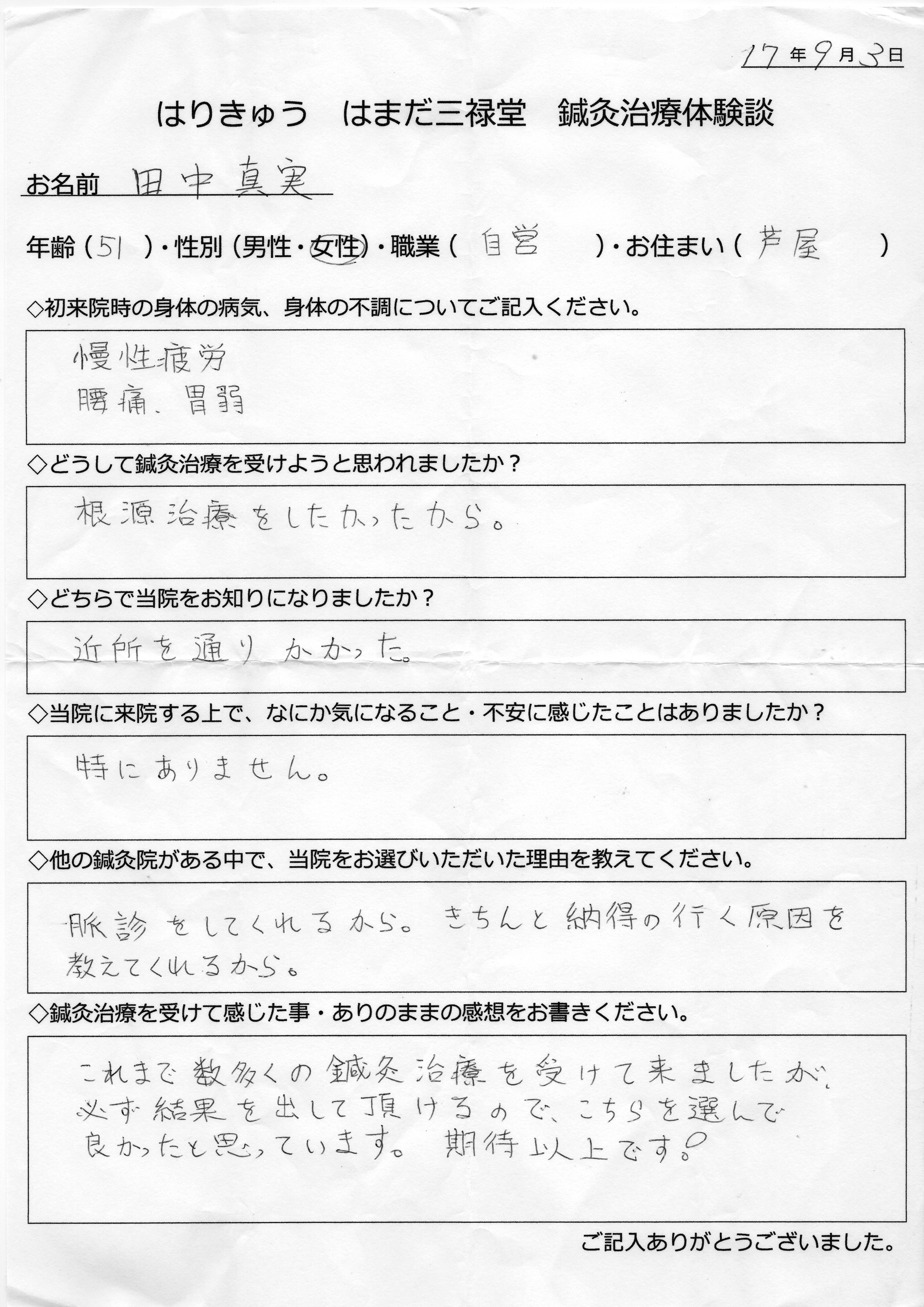 「これまで数多くの鍼灸治療を受けて来ましたが、必ず結果を出して頂けるのでこちらを選んで良かったと思っています。期待以上です!